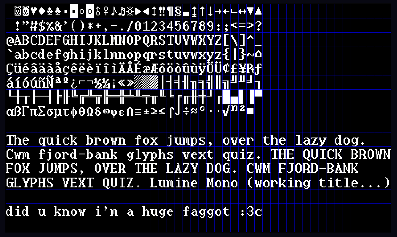 anyway here have a garbage font designed as a replacement for the default ibm vga font that i barely spent more than like three hours on because i cannot be bothered