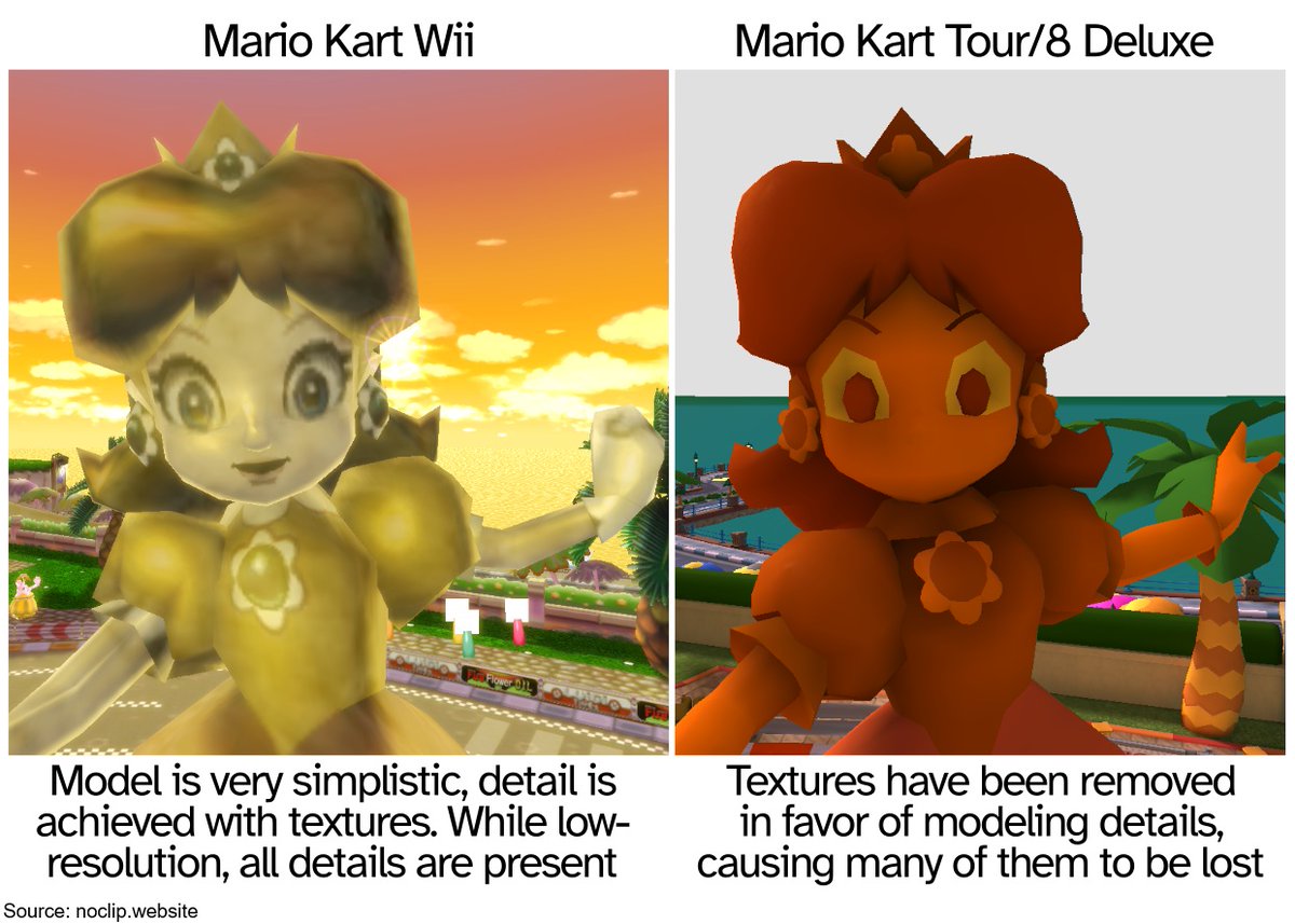In Mario Kart Wii, the statues on Daisy Circuit are simple, but achieve detail through textures. A stylistic change in Mario Kart Tour/8 Deluxe eschews the textures and attempts to model the details instead, resulting in a much rougher look despite having more polygons.