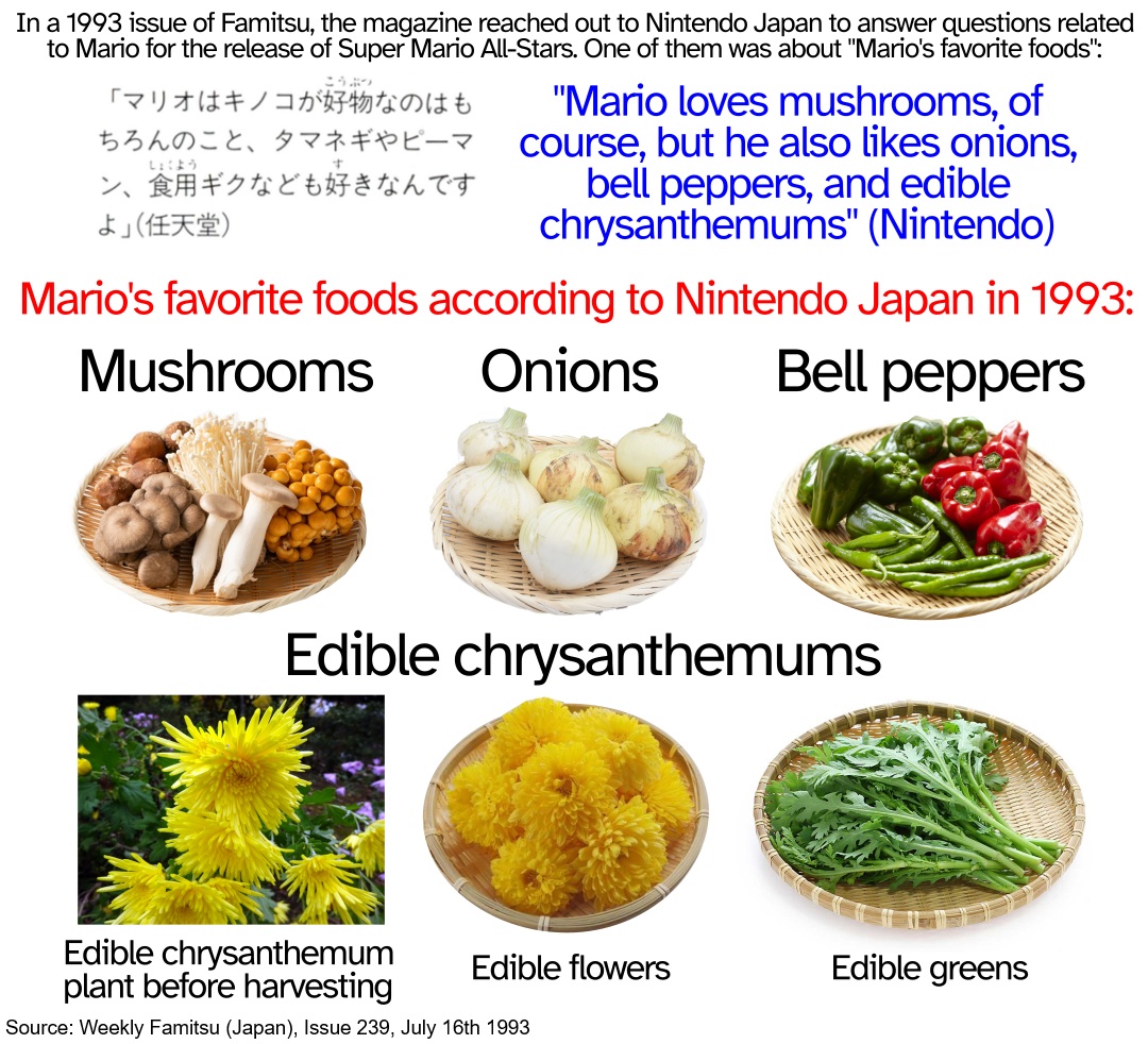 In 1993, the Japanese Famitsu magazine inquired Nintendo about Mario's favorite foods. Nintendo replied that Mario's favorite foods are mushrooms, onions, bell peppers, and surprisingly, edible chrysanthemums.